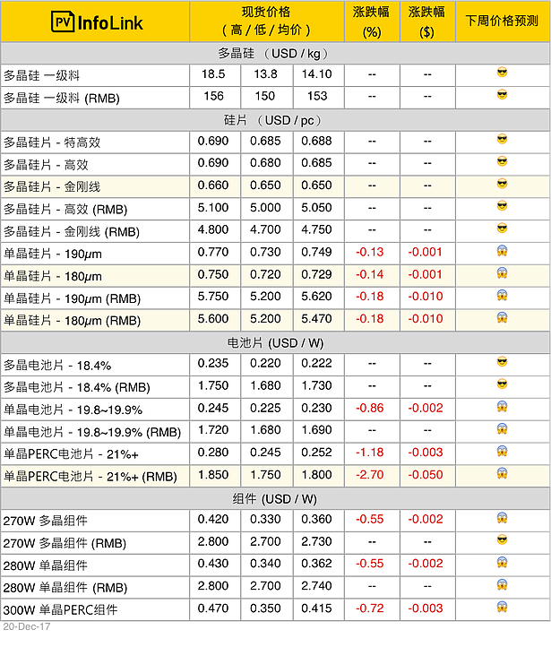 多晶電池片需求仍旺,價(jià)格高檔維穩(wěn)在海外砂線切電池片每瓦0.220 - 0.222元美金、金剛線切電池片每瓦0.216 - 0.219元美金上下。但接近年關(guān),組件廠也需要做庫(kù)存的控制與調(diào)節(jié),使得本月底多晶電池片的訂單洽談出現(xiàn)觀望氛圍,待下周狀況才能逐漸明朗。