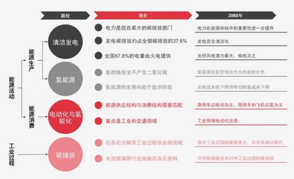 實(shí)現(xiàn)碳中和的途徑主要包括:電力生產(chǎn)清潔化,發(fā)展氫能源,交通和工業(yè)的電動(dòng)化/氫能化及碳捕捉四個(gè)方面。我們預(yù)測(cè)2060年的中國(guó)將有以下變革: