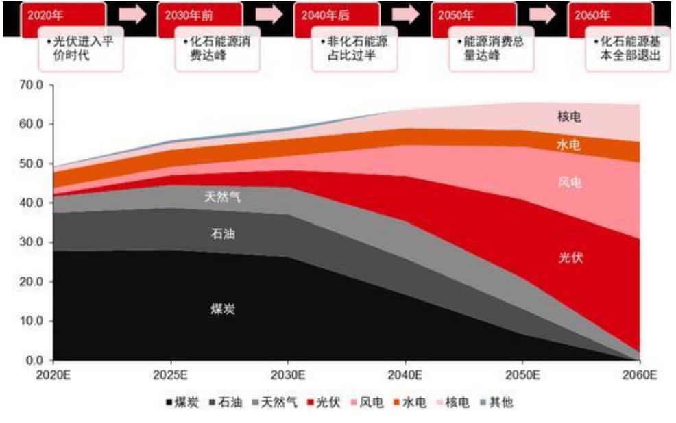 實(shí)現(xiàn)碳中和的堅(jiān)定決心將深刻影響中國(guó)的能源結(jié)構(gòu)、工業(yè)生產(chǎn)與消費(fèi)方式。實(shí)現(xiàn)碳中和的關(guān)鍵,在于使占85%碳排放的化石能源實(shí)現(xiàn)向清潔能源的轉(zhuǎn)變。2020年非化石能源占比約為16.4%,預(yù)計(jì)2030年將達(dá)到26.0%,2060年接近100%。增量主要由光伏風(fēng)電貢獻(xiàn)。