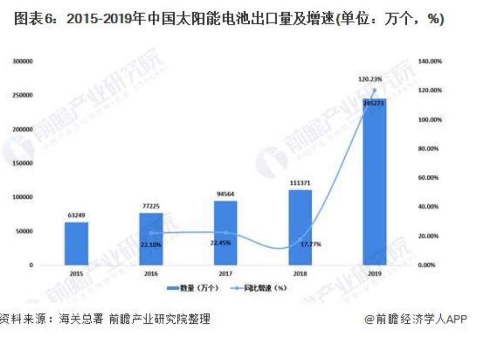 在出口方面,2015-2019年我國太陽能電池出口數(shù)量逐年增加。根據(jù)海關總署數(shù)據(jù)顯示,2015年我國太陽能電池出口數(shù)量僅有63249萬個,到了2019年增加到245273萬個,較2018年同比增長120.23%。出口規(guī)模及增速均創(chuàng)2012年歐美挑起“雙反”以來的新高