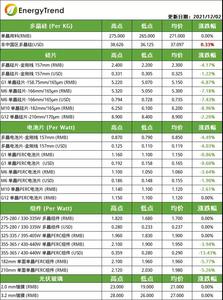 據(jù)集邦新能源12月2日最新光伏產(chǎn)業(yè)鏈價格信息,硅料環(huán)節(jié),目前整體硅料價格無明顯波動,單晶用料的均價維持在271元/KG;本周硅片報價大幅下跌,M6、M10報價明顯下滑。硅料本周硅料報價弱勢維穩(wěn),硅料成交壓力激增。本周大部分企業(yè)開始洽談12月份新訂單,由于下游近期不斷出現(xiàn)下調(diào)的信號,降價壓力也不斷傳導(dǎo)至硅料環(huán)